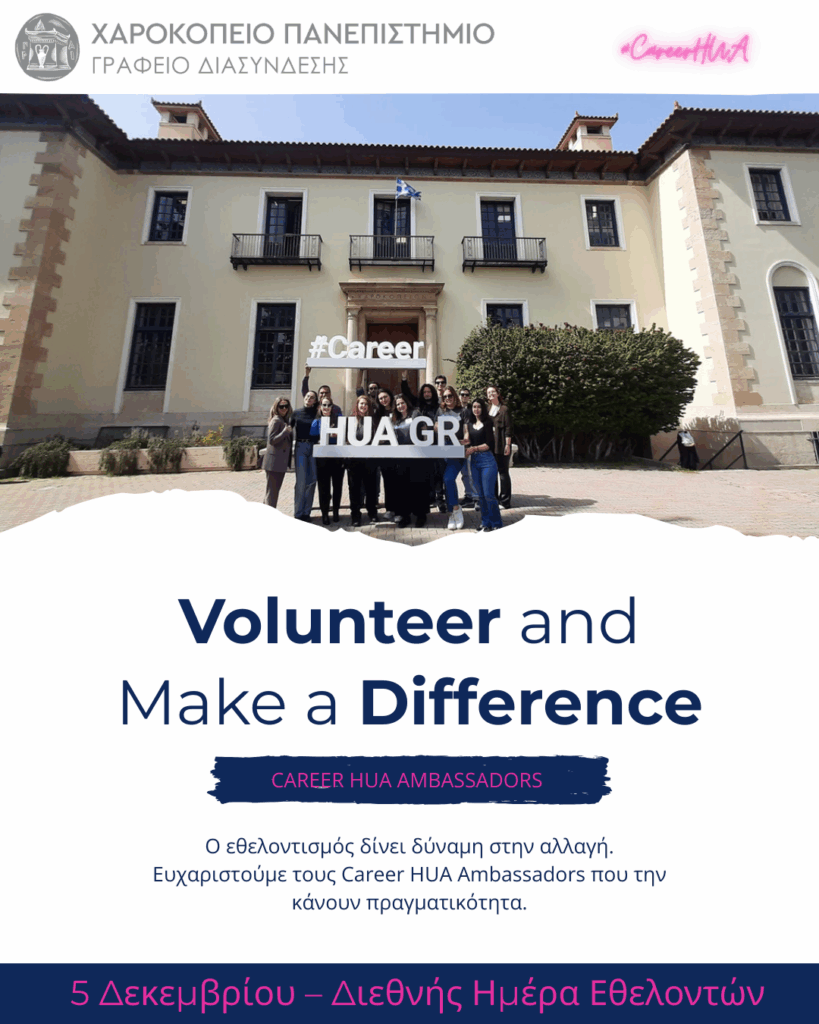 Σήμερα, με αφορμή τη Διεθνή Ημέρα Εθελοντών, εκφράζουμε την πιο θερμή μας ευγνωμοσύνη προς τους Career HUA Ambassadors για την έμπνευση, την αφοσίωση και την πολύτιμη προσφορά τους στην ακαδημαϊκή κοινότητα του Χαροκοπείου Πανεπιστημίου.