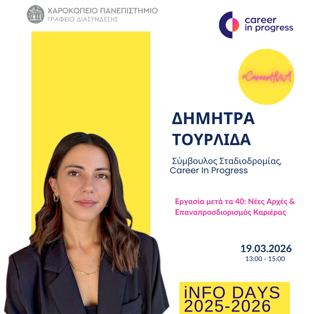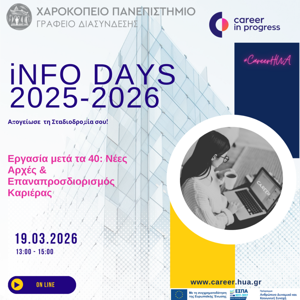 Το Γραφείο Διασύνδεσης Σπουδών & Σταδιοδρομία διοργανώνει την Info Day 15, σε συνεργασία με την Career In Progress, με θέμα τις νέες επαγγελματικές ευκαιρίες και τον επαναπροσδιορισμό της καριέρας μετά τα 40.