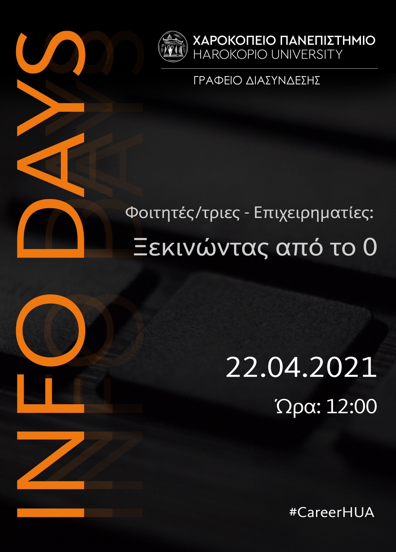 Το Γραφείο Διασύνδεσης Σπουδών και Σταδιοδρομίας του Χαροκοπείου Πανεπιστημίου σε συνεργασία με το Mindspace NPO διοργανώνουν διαδικτυακή “Ημέρα Ενημέρωσης” με θέμα: “Φοιτητές/τριες – Επιχειρηματίες: Ξεκινώντας από το 0” την Πέμπτη 22 Απριλίου 2021 στις 12:00.