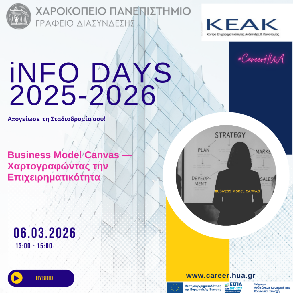 Το Γραφείο Διασύνδεσης Σπουδών & Σταδιοδρομίας διοργανώνει την Info Day 13, σε συνεργασία με το ΚΕΑΚ, με θέμα το εργαλείο Business Model Canvas και τη στρατηγική χαρτογράφηση μιας επιχειρηματικής ιδέας.