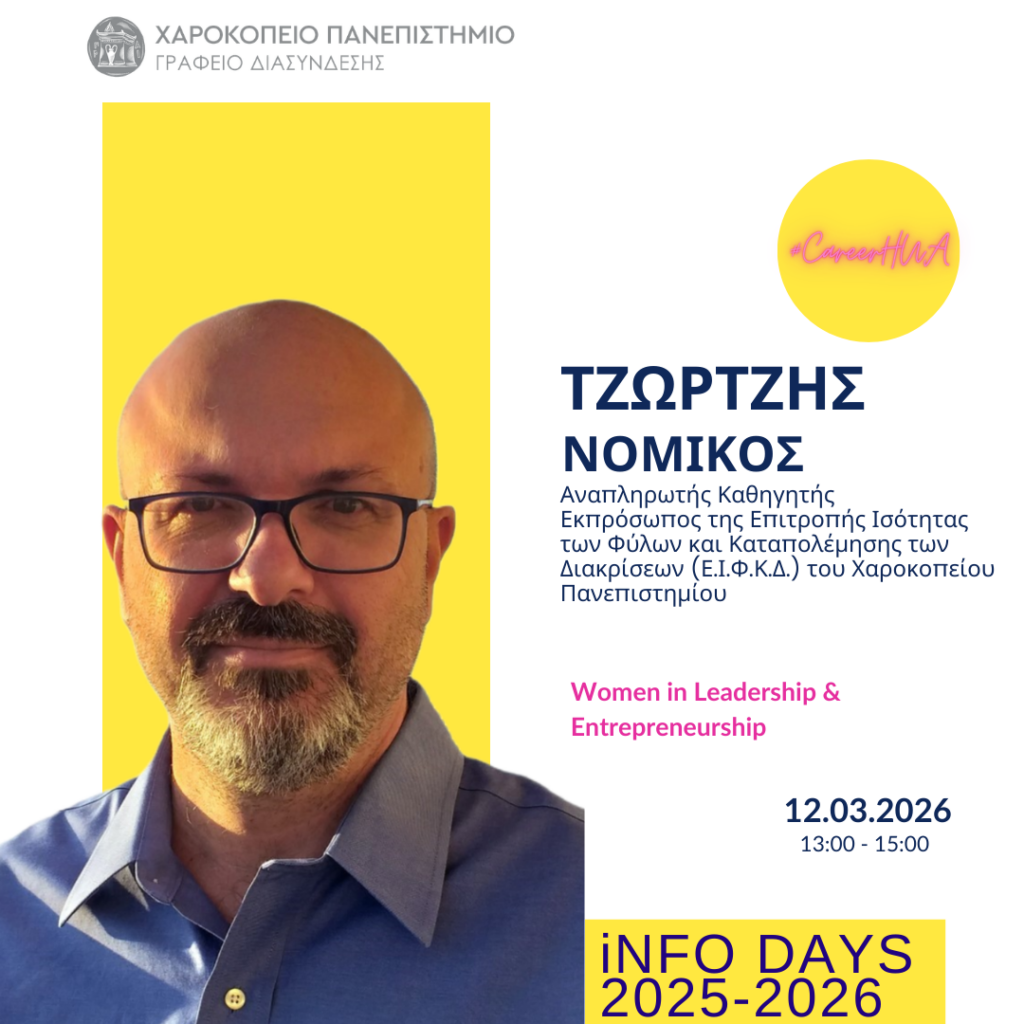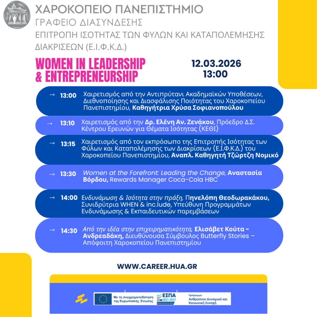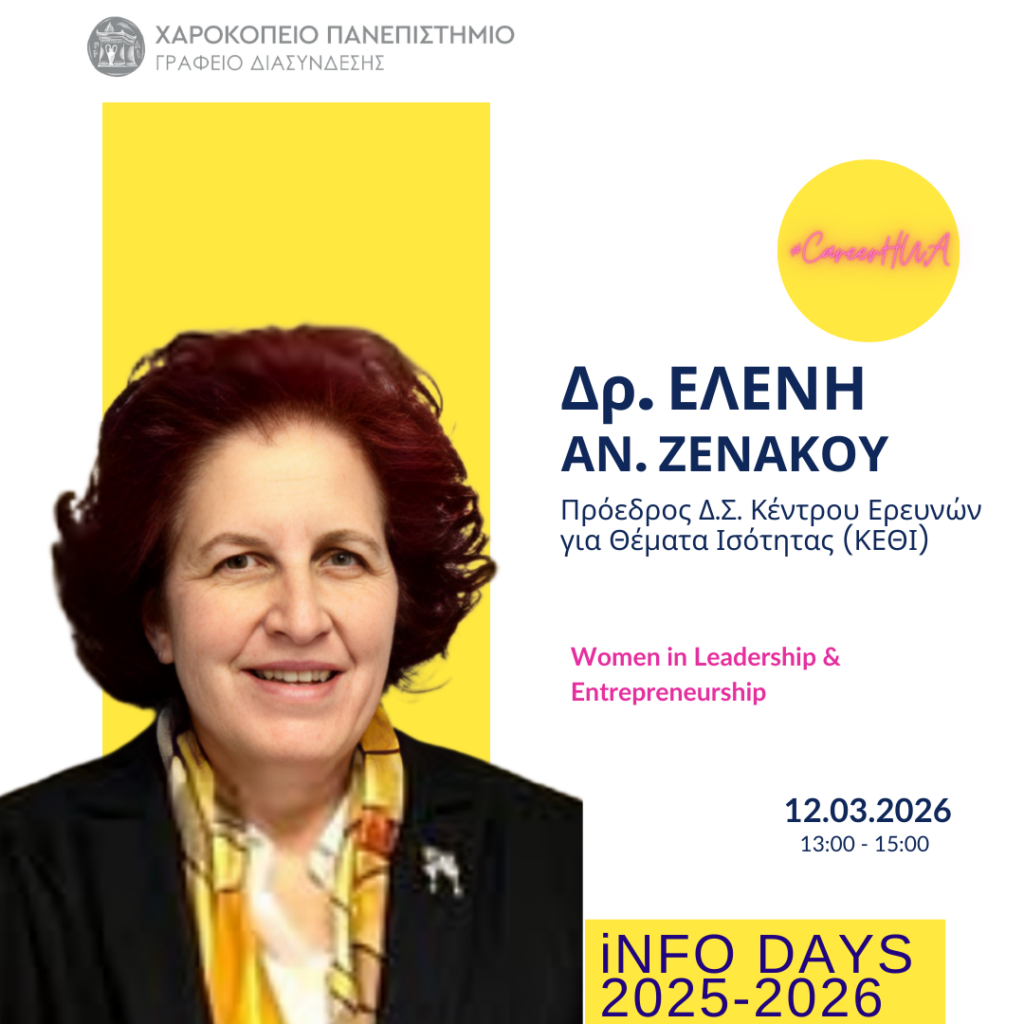 Το Γραφείο Διασύνδεσης Σπουδών & Σταδιοδρομίας σε συνδιοργάνωση με την Επιτροπή Ισότητας των Φύλων και Καταπολέμησης Διακρίσεων (Ε.Ι.Φ.Κ.Δ.) του Χαροκοπείου Πανεπιστημίου, διοργανώνει την Info Day #14 με θέμα: Women in Leadership & Entrepreneurship.