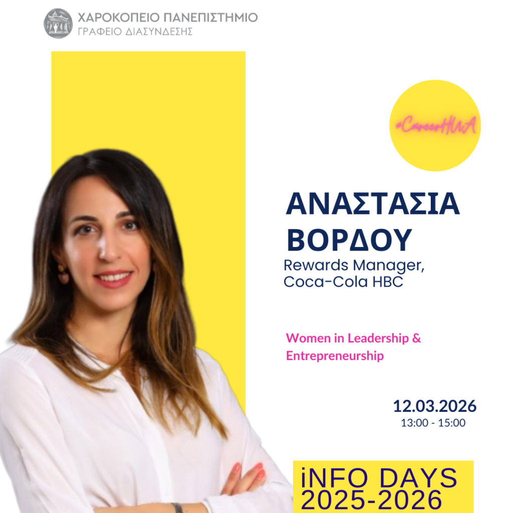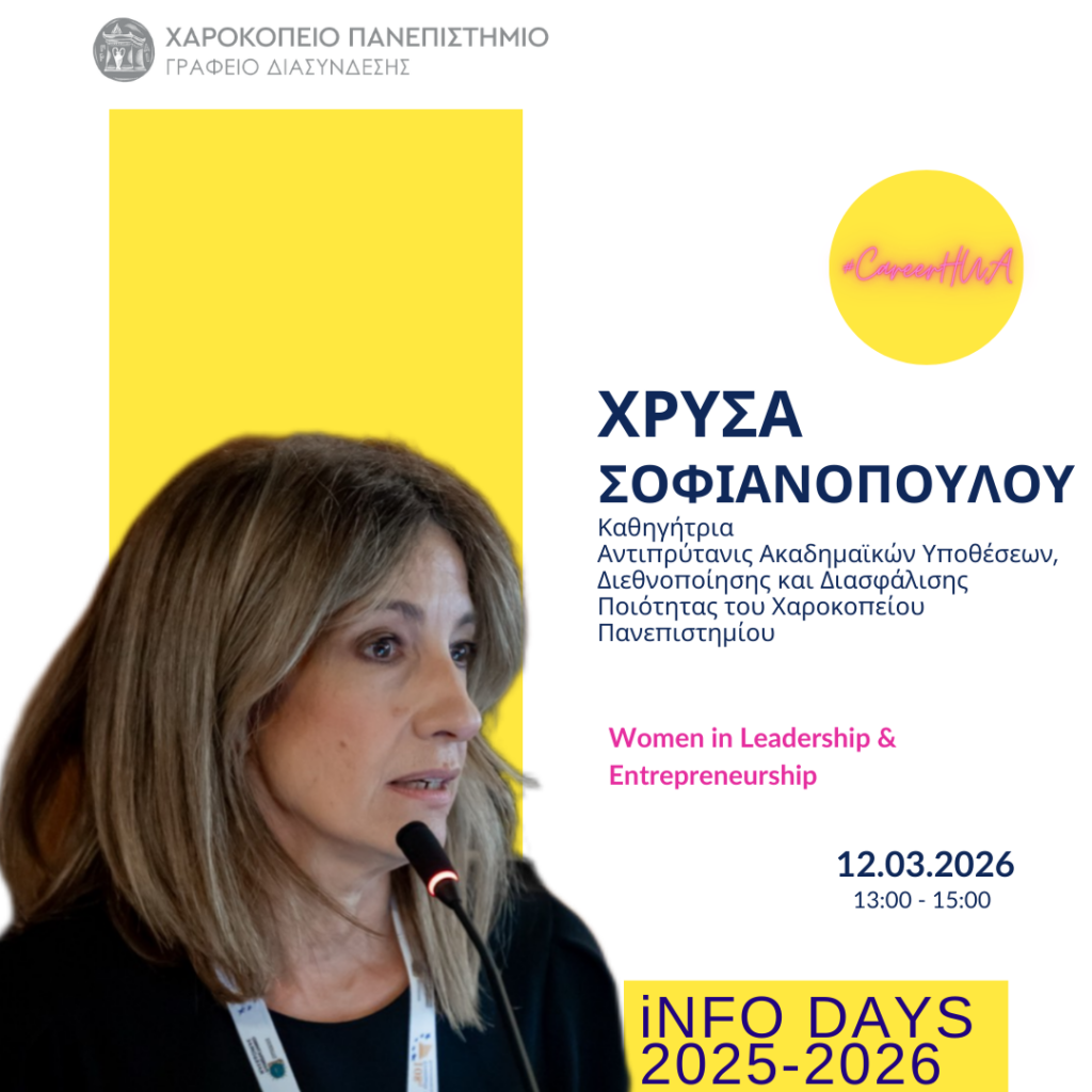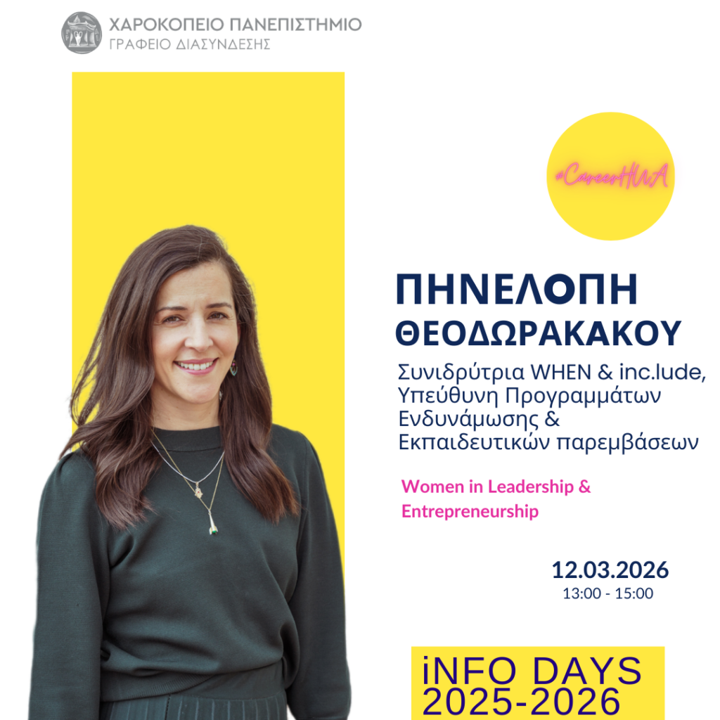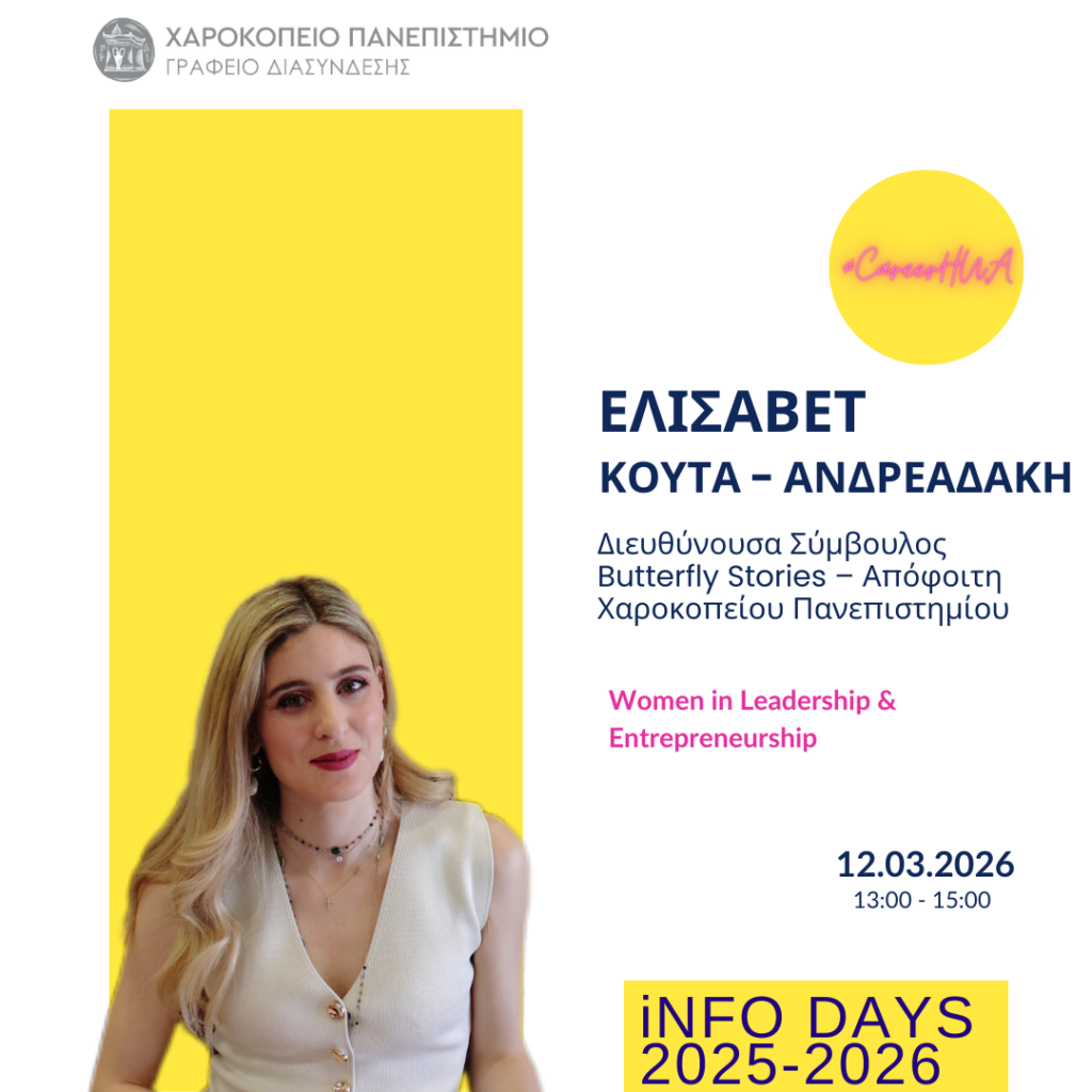 Το Γραφείο Διασύνδεσης Σπουδών & Σταδιοδρομίας σε συνδιοργάνωση με την Επιτροπή Ισότητας των Φύλων και Καταπολέμησης Διακρίσεων (Ε.Ι.Φ.Κ.Δ.) του Χαροκοπείου Πανεπιστημίου, διοργανώνει την Info Day #14 με θέμα: Women in Leadership & Entrepreneurship.